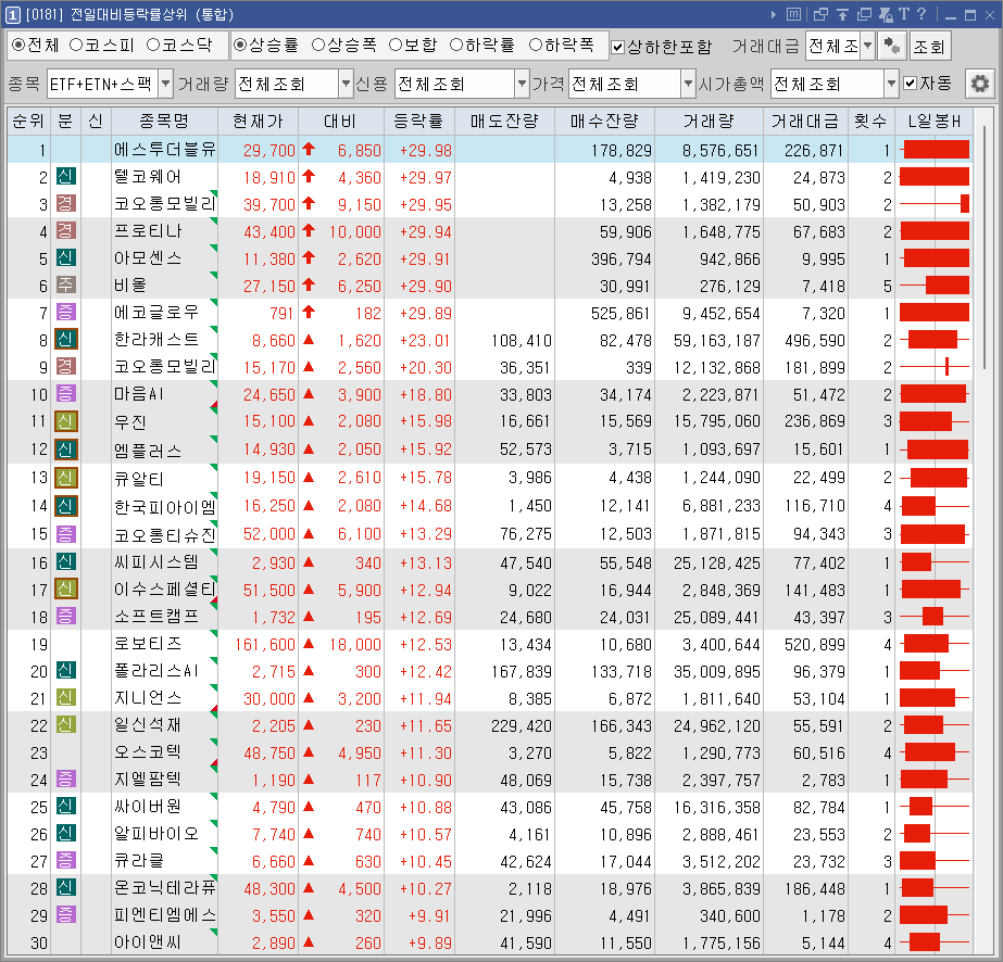 | 프로티나 | 상한가 | 676억 | 바이오 | 미국 다국적 제약사와 11.74억 규모 공급계약 체결 모멘텀 지속 |